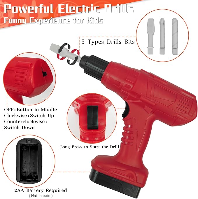 - Electric Drill Toys Set: Equipped with a battery-powered toy drill featuring 3 interchangeable bits, rotates clockwise/counterclockwise and simulates realistic sounds and movements with just 2 AA batteries(Not Include). This tool set with drill provides an immersive experience for kids, sparking creativity and imagination
