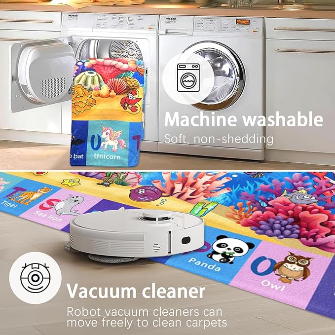 - 3. Funny Kids bedroom rugs: The Funny kids carpets nursery rugs for playroom are composed of 26 letters, animals, shapes, colors, months, etc.; Children's educational rug mats animal ABC rugs can enhance cognitive development while children explore and play. Playroom Floor Mat for Nursery enhance the interaction between you and your children while improving their cognitive and sensory abilities.