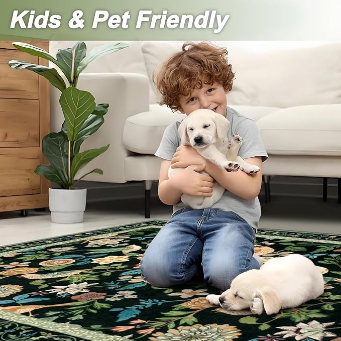 Floral Washable 5x7 Area Rug, Boho Birds Black/Green Rugs for Living Room Soft Non-Slip Vintage Flower Bedroom Rug, Low Pile Botanical Indoor Carpet for Nursery Playroom Dining Room