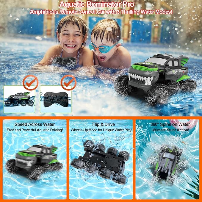 - 【All-Terrain Amphibious RC Car】 This amphibious off-road RC car features a fully sealed waterproof design. The motor, battery compartment, and power button are protected by soft silicone seals, ensuring high-strength waterproof performance. Even the remote control is waterproof! This RC car effortlessly conquers land, beaches, mud, grass, and snow. Not just an all-terrain RC truck, it also doubles as an exciting pool and lake toy, surfing across rivers, ponds, and other water surfaces. Plus, it can even flip over and drive underwater!