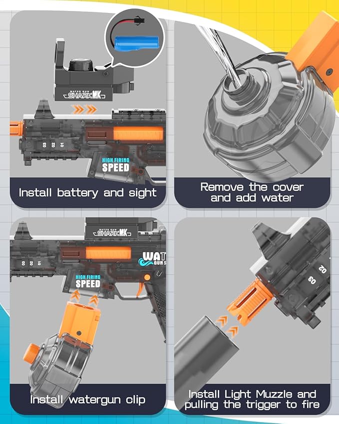 • Ultimate Water Combat Kit: Includes water gun, 2x charging cables, water bomb drum, scope, and silencer – everything for epic summer games