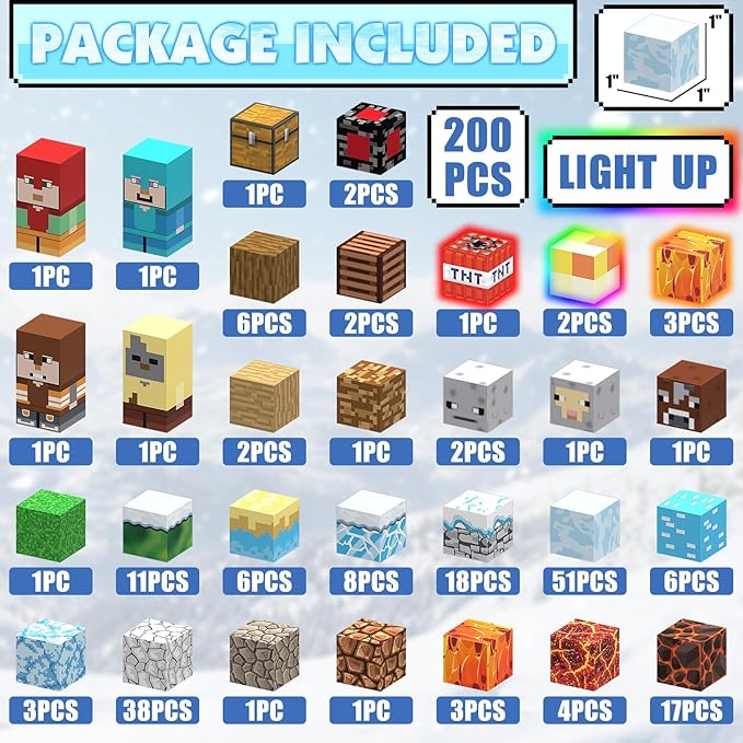 • Countless Possibilities: 200 PCS magnetic building toys sets feature a variety of patterns for kids ages 3+, 6 special blocks that light up to spark their curiosity, imagination and encouraging exploration. They offer endless creative possibilities in themed assembly.Block Size: 1x1x1 inch