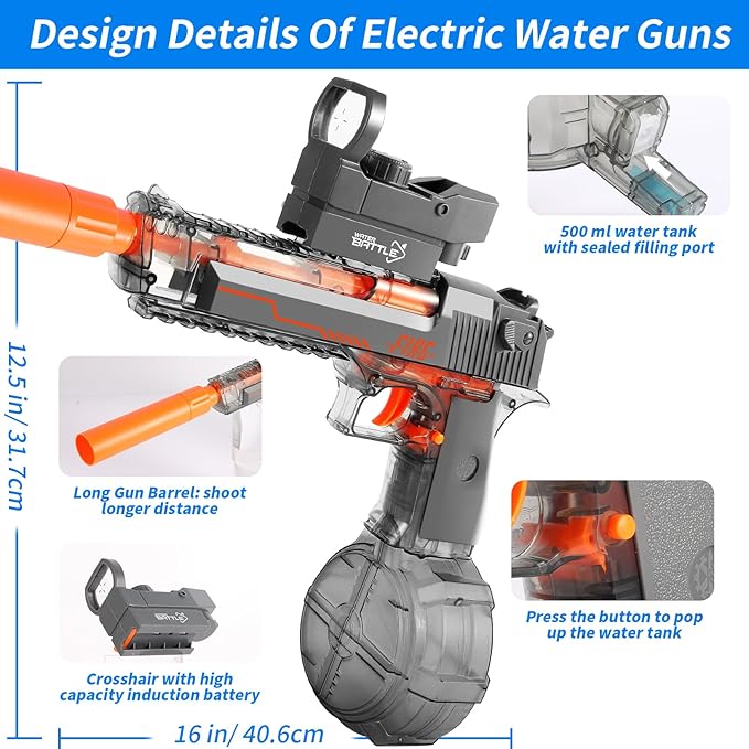 - 500ml Large Capacity Removable Water Tank: Water guns with 500ml sealed leak-proof water tank, with a scope to accurately locate the target, long barrel to enhance the distance of the water jet, in a variety of summer water games, to reap the novelty and excitement of the experience, to become a “sharpshooter” in the water battlefield
