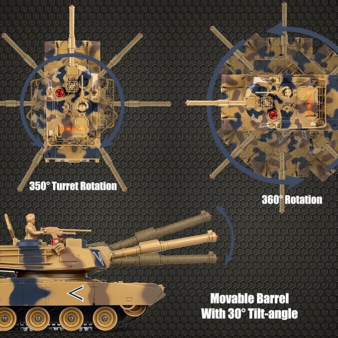 - 【Other Realistic Detailed Features】: RC tank that shoots with many of functions, such as forward and backward , right and left spin, 360 degrees central rotation, turret 330 degrees rotation, barrel up and down, 40 degree climbing slope. When turn on both tank and remote, tank will demonstrate all functions automatically with cool lights on, which allows you to play in the dark.