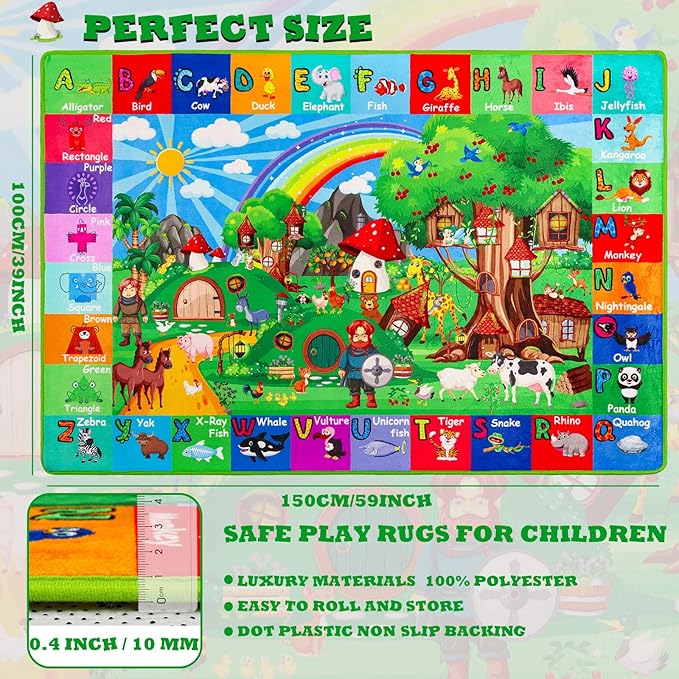 - 💙【 Hobbit House Animals ABC Play Mat】 💙Magical Learning Ecosystem.This kids rug features a vibrant and engaging design that includes 26 alphabet letters paired with 26 different animals,shapes combined with animal forms and colors. It’s perfect for educational activities and games.
