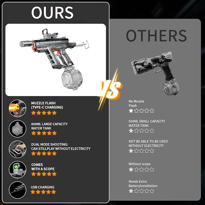 • Waterproof split battery :Why the split batteries, you ask? Well, let me tell you, they’re the real game changers! With our ingenious split battery design, you can easily replace or recharge batteries without turning your backyard into a mini swimming pool. Imagine the joy of keeping the water flowing while the competition sits on the sidelines waiting for a recharge! Plus, with our waterproof casing, the lithium batteries remain snug and dry, so kids can unleash their inner water warriors without a worry.