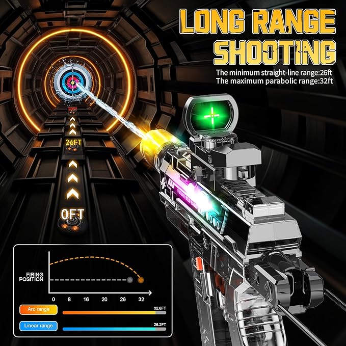 • Long shooting distance:Imagine this: you're on a sunny day, prowling the backyard like a stealthy ninja, and BOOM! You zap them with a straight-line range of 26 feet! And if you really want to reach for the stars (or just the next yard), our parabolic range takes it to a jaw-dropping 32 feet. Perfect for kids who want to reign supreme in their splash-tastic showdowns, teens looking for some serious summer shenanigans, or adults who just want a valid excuse to act like a kid again (we won’t tell!).