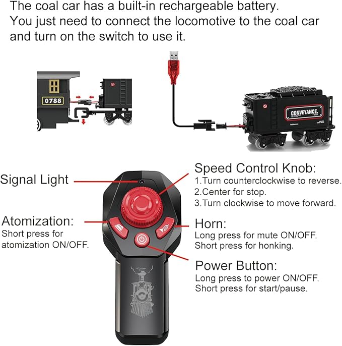 - 【Electric Train Toy with Remote Control】Compared to other ordinary trains on the market, our electric train set use remote controls. It features start switch trumpet / atomization switch, backward / forward and speed adjustment. These functions provides most convenient and most interesting for kids entertainment.