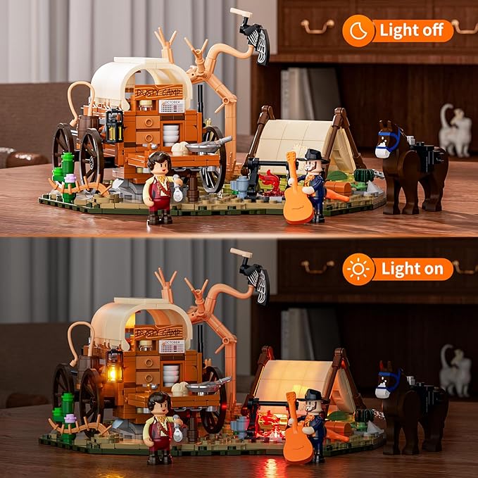 FUNWHOLE Cowboy Camp Lighting Building-Bricks Set - The Old West Shelter with Covered Wagon and Horse 542 Pcs Collection Display Set for Adults and West Lovers