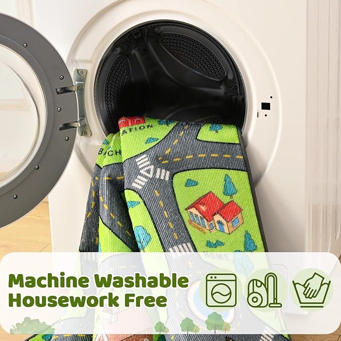 - Durable and Safe: This green gray kids car carpet machine-made digital printed, so it's sturdy, super cute with vibrant colors. Durable rubber bottom helps it grip the floor and keeps kids safe
