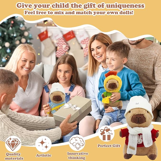 - Easy to Dress Up: The costumes and accessories in this set are expertly designed with a perfect fit for the capybara plush. This allows kids, whether playing alone or in groups, to effortlessly dress and redress the capybara, enhancing their playtime experience.This capybara clothes for plush set is ideal for both solo play and group activities.