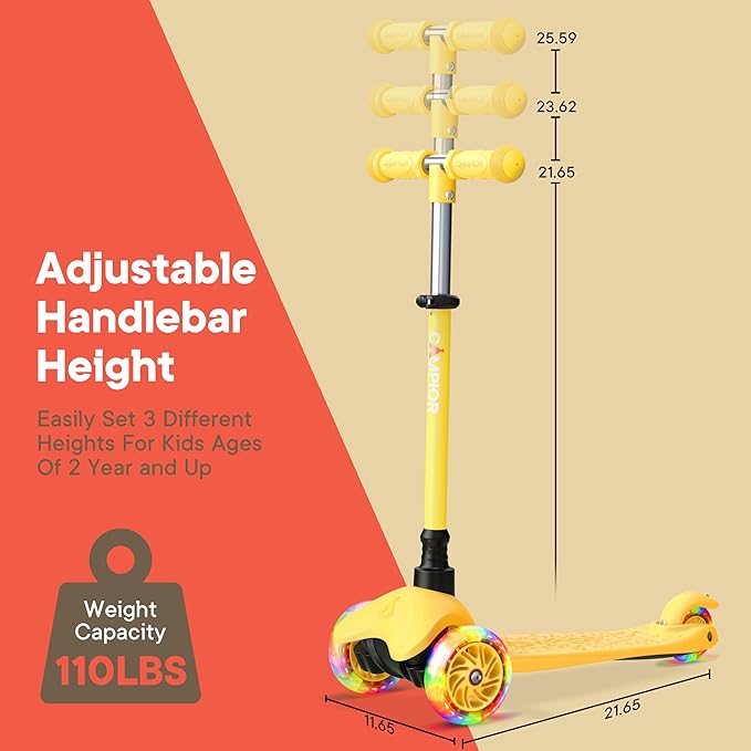 • GROWS WITH YOUR CHILD – The adjustable T-bar handlebar offers four height settings (21.65’’, 23.62’’, 25.59’’, and 27.56’’ inches), making this scooter the perfect ride for as young as 2 year old and growing kids up to 110 lbs.