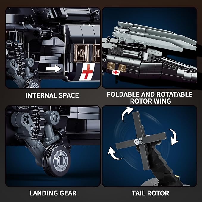 - 【Rich in Details】The cockpit boasts decal stickers for a comprehensive instrument panel & control sticks. Center console gauges add authenticity. Left fuselage features a manual winch for added play value. Cabin doors detach & attach to sides for easy opening, accommodating minifigures & unique display. Plus, foldable tail rotors & rotatable tail section enhance realism, while detailed weaponry settings bring battle scenarios to life