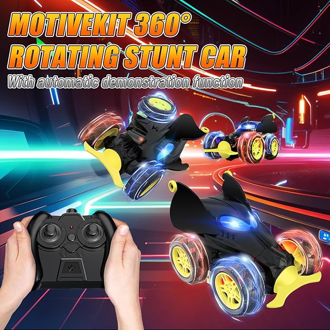 - Stable wireless control:Adopts built-in 2.4G anti-interference technology to ensure smooth and unhindered remote control operation. The RC stunt car is equipped with 360° rotation and upright driving function, and the front part of the car can be rotated individually, enriching the gaming experience and enjoying endless fun. In addition to the basic driving function, the car also has an automatic demonstration function, suitable for novices and children. The front part of the car can be rotated individually, enriching your gaming experience and bringing you endless fun!