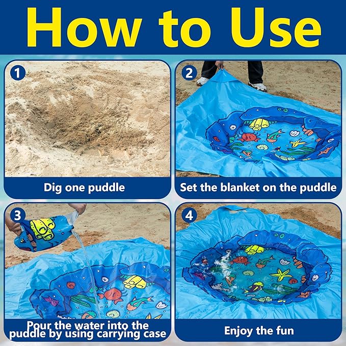 • Easy to Use: Our cartoon beach pool is is uniquely designed. Simply unpack it, dig a hole on the beach, place the mat in the hole, and fill the central area with water for kids to enjoy