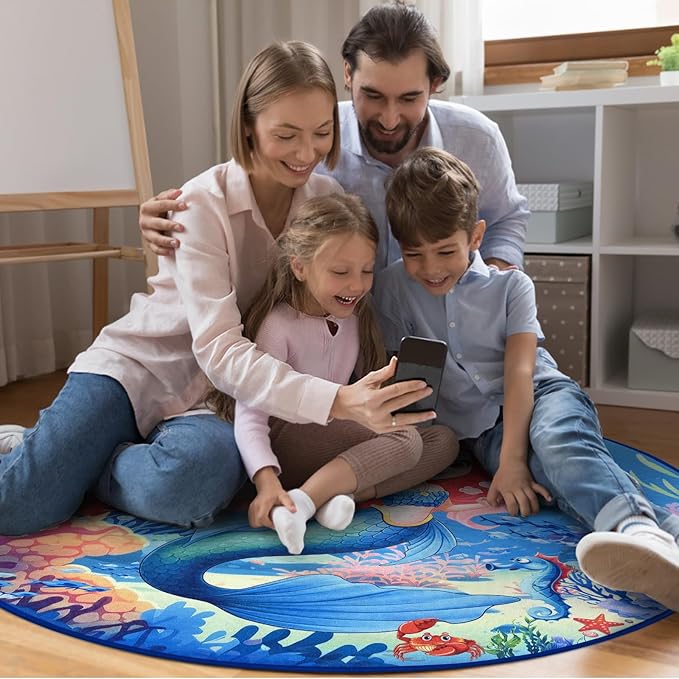 Round Rug for Kids Room Mermaid Rugs for Bedroom Kids Rugs for Playroom Girls Cute Cartoon Carpet Living Room Dining Room Decor 47x47 inch