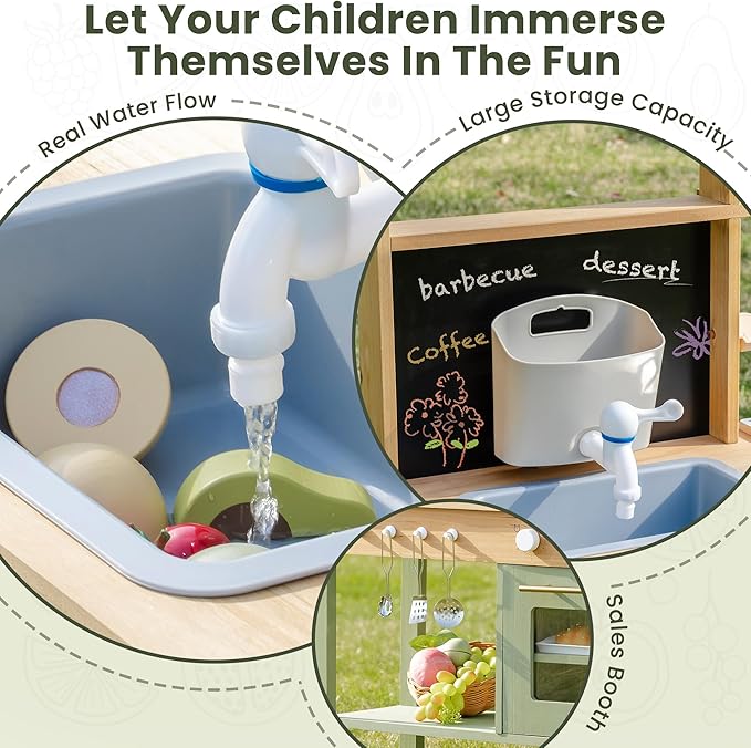 • 【Imagination & Social Development】 With the outdoor mud kitchen for kids, kids can mimic adult behaviors, fostering their social skills and enhancing their narrative abilities, all while staying engaged and active.