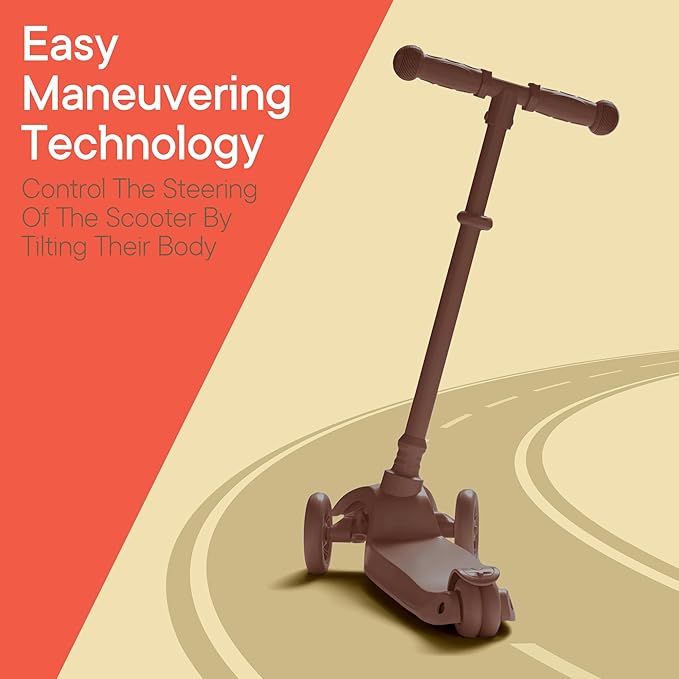 Brown Mini 3 Wheel Scooter for Kids – Lean-to-Steer with LED Light-Up Wheels, Adjustable Handlebar, Wide Anti-Slip Deck, Smooth PU Wheels, Rear Foot Brake – Toddler Scooter for Ages 2+