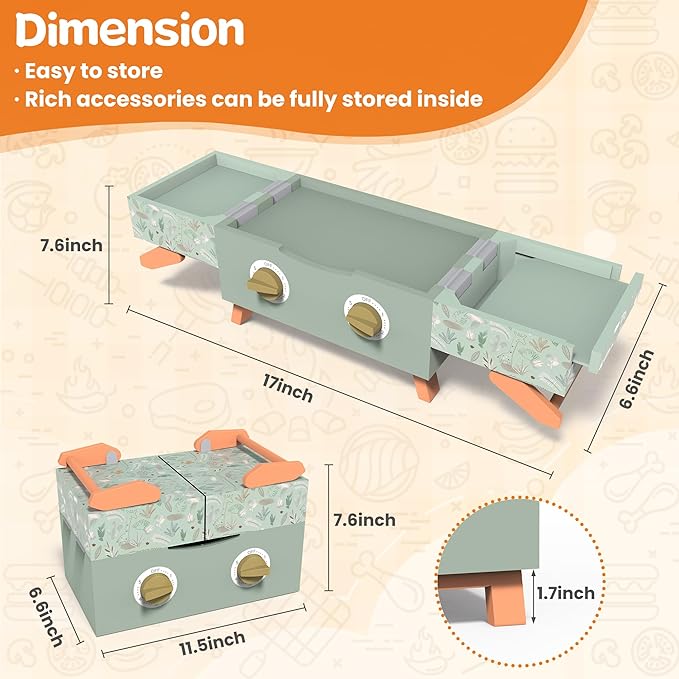 - MULTIFUNCTIONAL WOODEN STORAGE: Designed for both play and practicality, this BBQ toy kit comes with a sturdy wooden storage box that doubles as a simulated grill station. Not only the crafted box keep all accessories organized, but its lift-up lid transforms into a perfect grilling surface during playtime. This smart design helps maintain a tidy play environment while playing