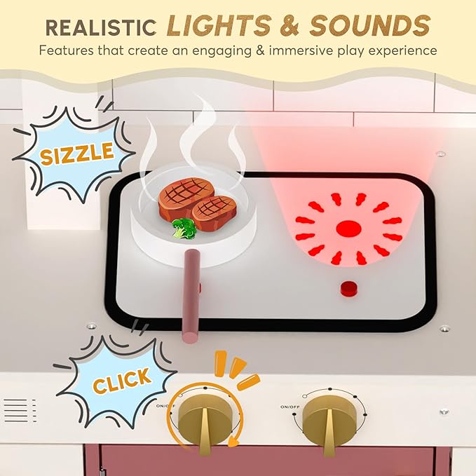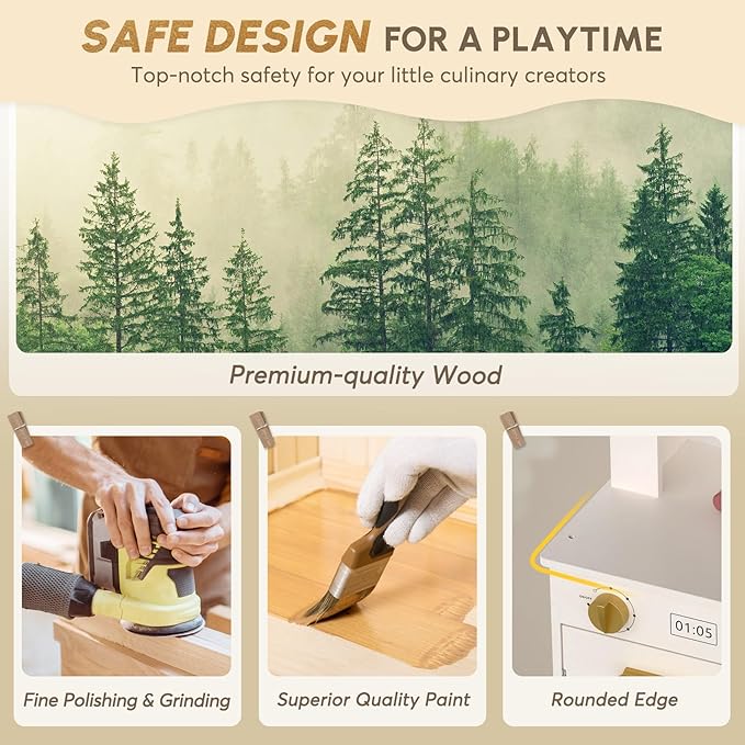 - Premium Wooden Play Kitchen: Play kitchen is crafted from ๐๐๐๐ & ๐๐๐๐๐ certified wood materials, ๐๐๐-๐ ๐ซ๐๐, and coated with non-toxic paint. It's sturdy & durable, and absolutely safe for kids. It also includes various cooking utensils with realistic with ๐ฅ๐ข๐ ๐ก๐ญ๐ฌ & ๐ฌ๐จ๐ฎ๐ง๐๐ฌ, making pretend play more vibrant and engaging