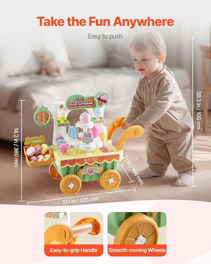 - 【Easy to Move】With a comfy handle and smooth-rolling wheels, kids can push their ice cream cart anywhere! Whether indoors or outside, they’ll enjoy pretending to serve ice cream and playing shop with friends.
