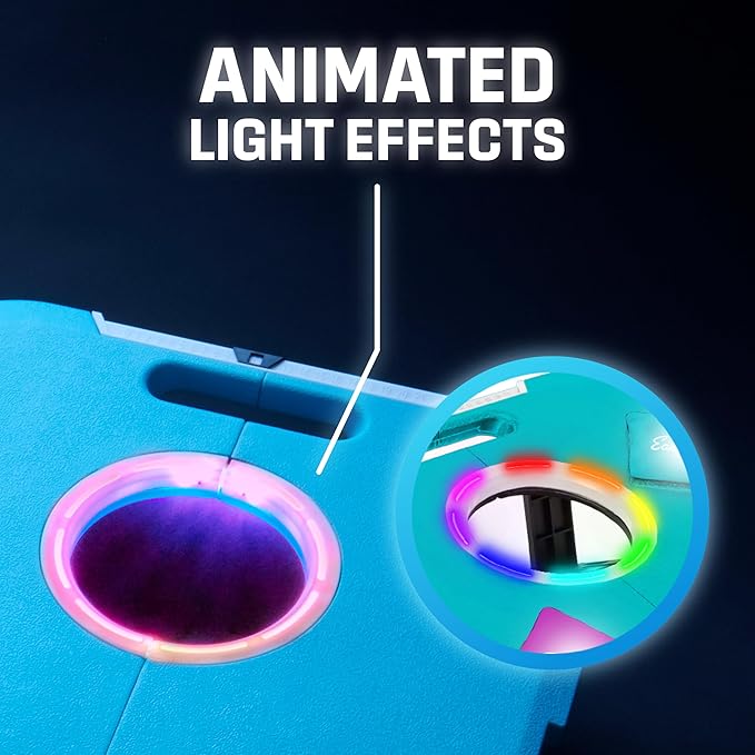 • This bean bag toss game includes 2 compact targets that measure 23.5” (L) x 18” (W) and 8 light-up bean bags in 2 team colors (Blue and Green). Throw, score and win.